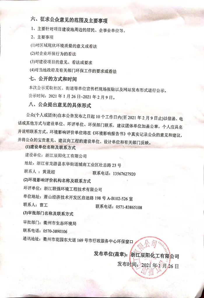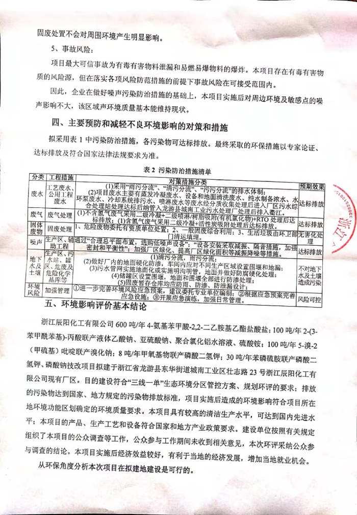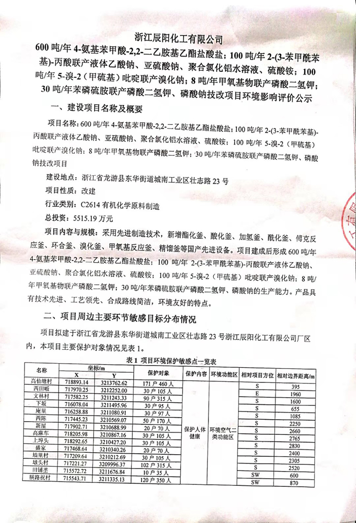 浙江辰陽化工有限公司600噸/年4-氨基苯甲酸-2,2-二乙胺基乙酯鹽酸鹽;100噸/年2-(3-苯甲酰苯基)-丙酸聯(lián)產(chǎn)乙酸鈉、亞硫酸鈉、聚合氯化鋁、硫酸銨;100噸/年5-溴-2(甲硫基)吡啶聯(lián)產(chǎn)溴化鈉;8噸/年甲氧基物聯(lián)產(chǎn)磷酸二氫鉀;30噸/年苯磷硫胺聯(lián)產(chǎn)磷酸二氫鉀、磷酸三鈉技改項(xiàng)目環(huán)境影響評(píng)價(jià)公示